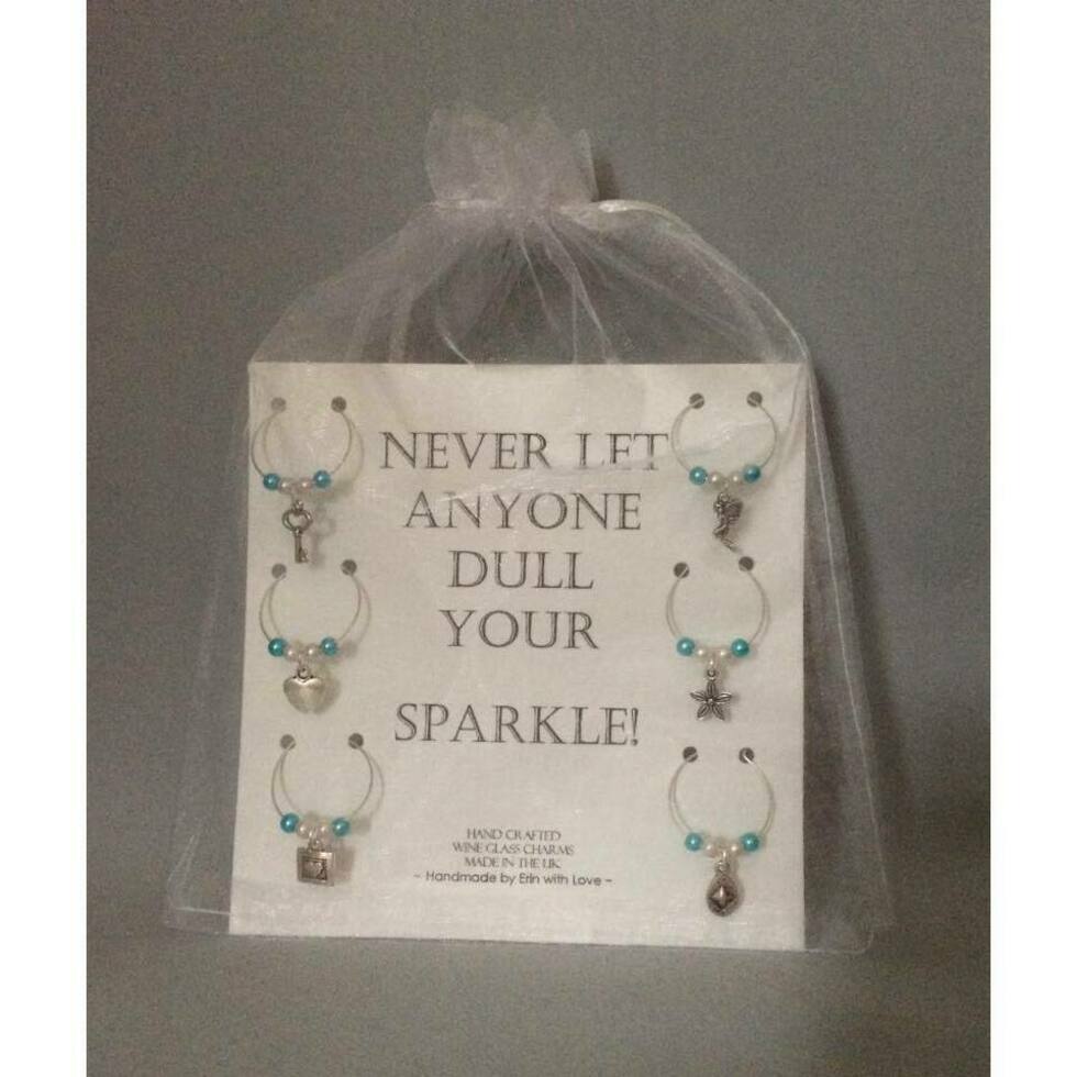 6 Individual Wine Glass Charms on a Textured finish printed message card and presented in an organza bag. Each Wine Glass Charm consists of a ring that clips around the stem or handle of your glass. On the ring you have 1 Aqua Blue accent colour bead and 1 white or cream Toner bead either side of the charm. Each Wine Charm Ring has a different charm so glasses never get mixed up at parties again!