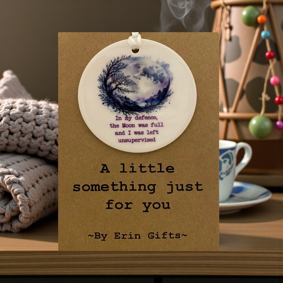 A printed ceramic disc ( which measure 7.5cm in diameter) with cord to hang it is supplied on an A6 sized single sheet card and sealed in fully recyclable clear packaging.