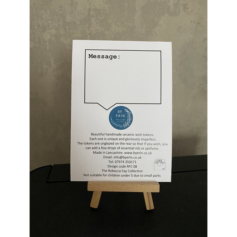 The finished Ceramic Wish Token & Message Card is packaged with an envelope and is presented in a fully recyclable polythene sleeve.
