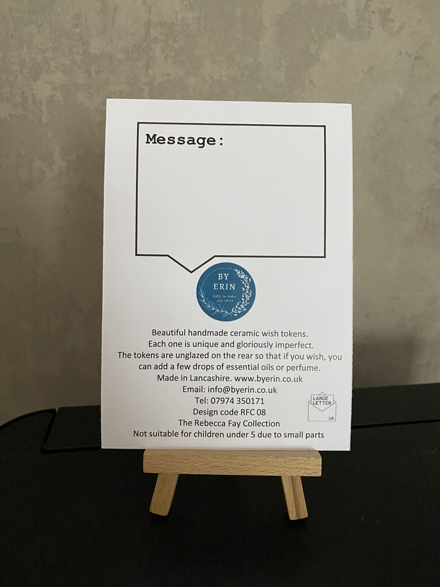 The rear of the Wish Token is un-glazed so that when taken off the card, it can be infused with Essential Oils or Perfumes etc.